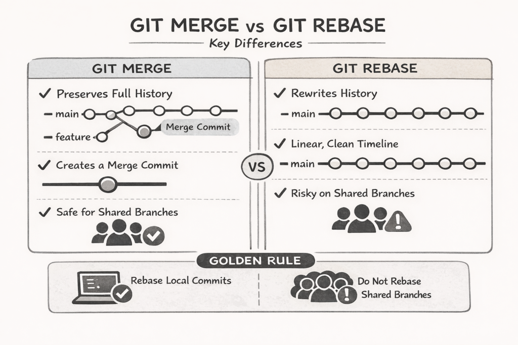 Both commands combine changes from different branches, but they do it in very different ways. Understanding the difference is essential for clean history, fewer conflicts, and safer collaboration.